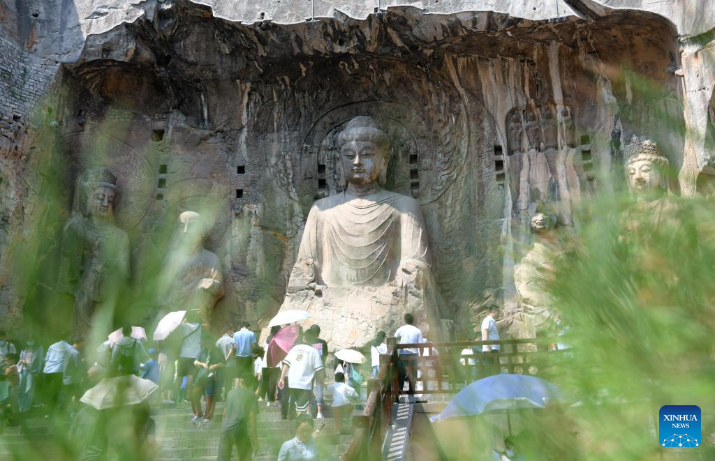 Tourists visit the Longmen Grottoes during the Mid-Autumn Festival holiday in Luoyang, central China's Henan Province, Sept. 11, 2022.
