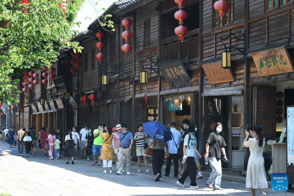 People visit Sanfangqixiang (Three Lanes and Seven Alleys), an ancient block, during the Mid-Autumn Festival holiday in Fuzhou, southeast China's Fujian Province, Sept. 11, 2022.