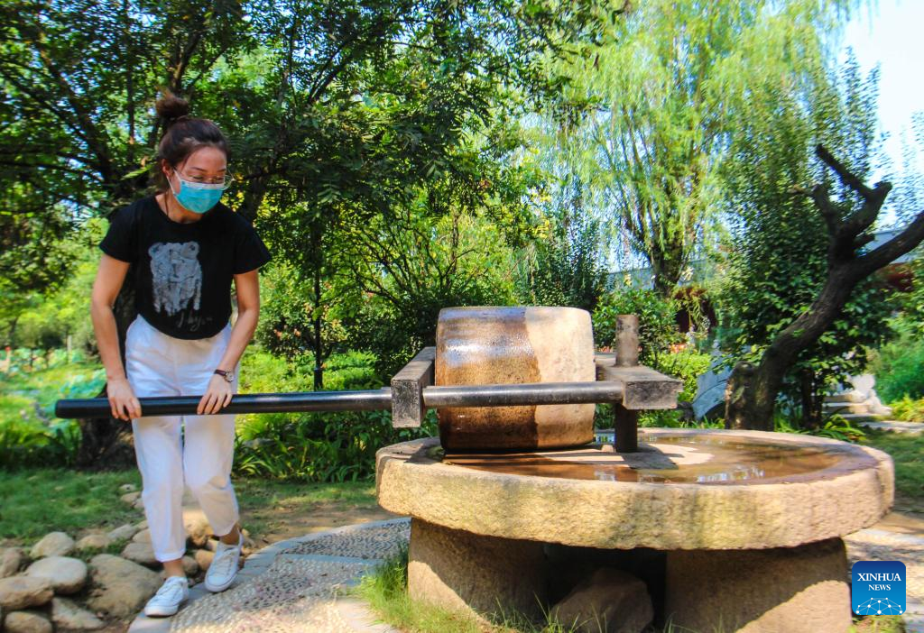 A tourist tries a stone mill during the Mid-Autumn Festival holiday in Nanyang, central China's Henan Province, Sept. 11, 2022.