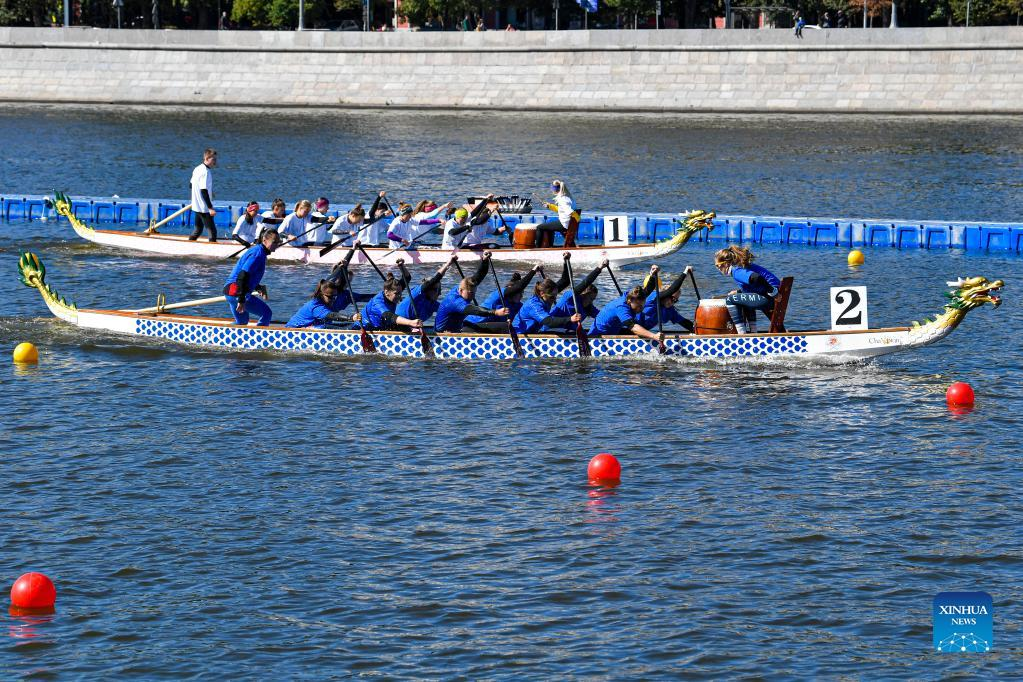 Athletes take part in a dragon boat event during Moscow City Day celebrations in Moscow, Russia, Sept. 10, 2022. A series of events were held on Saturday to celebrate Moscow City Day, marking the city's 875th founding anniversary. (Photo by Alexander Zemlianichenko Jr/Xinhua)