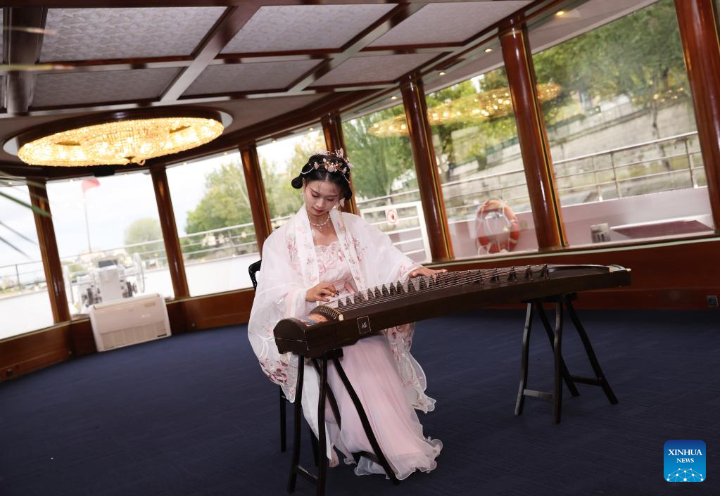 A Chinese student performs during Mid-Autumn celebrations aboard a cruise ship in Paris, France on Sept. 10, 2022. (Xinhua/Gao Jing)