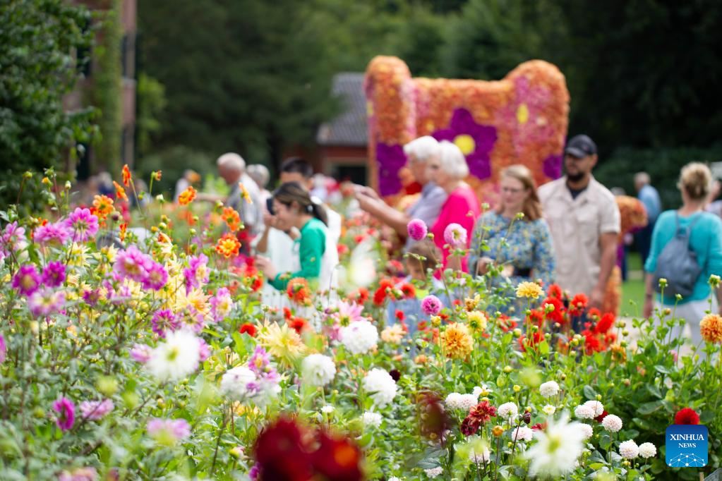 Visitors enjoy dahlia flowers at the Keukenhof Castle in Lisse, the Netherlands, on Sept. 11, 2022. (Photo by Sylvia Lederer/Xinhua)