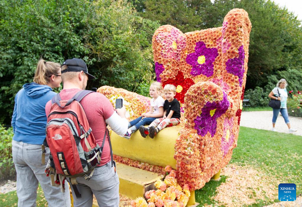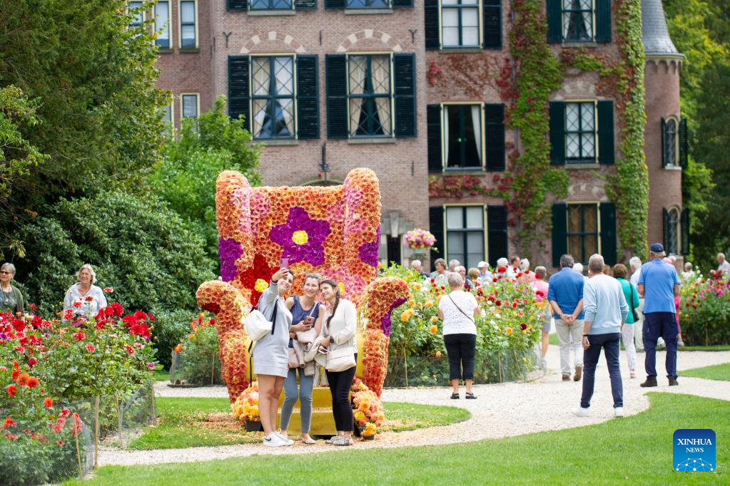 Visitors take pictures of a flower chair of dahlia at the Keukenhof Castle in Lisse, the Netherlands, on Sept. 11, 2022. (Photo by Sylvia Lederer/Xinhua)