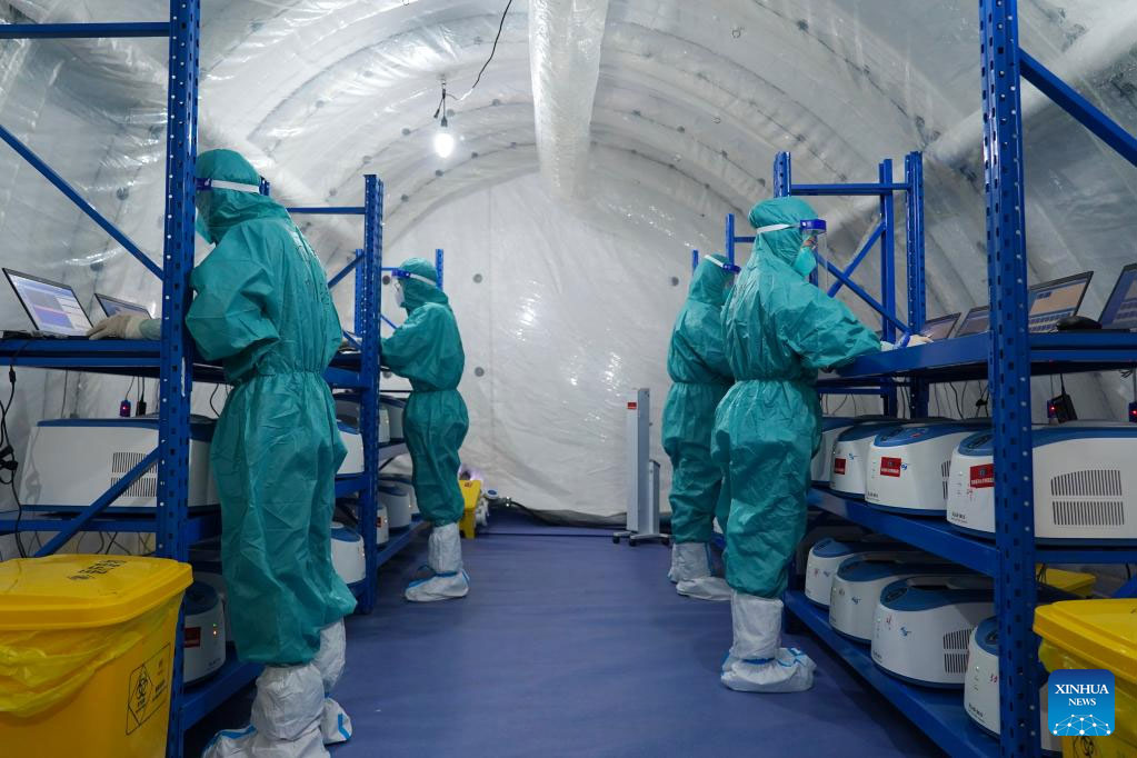 Medical workers work in an air-inflated testing lab in Chengdu, southwest China's Sichuan Province, Sept. 5, 2022. (Xinhua/Liu Qiong)