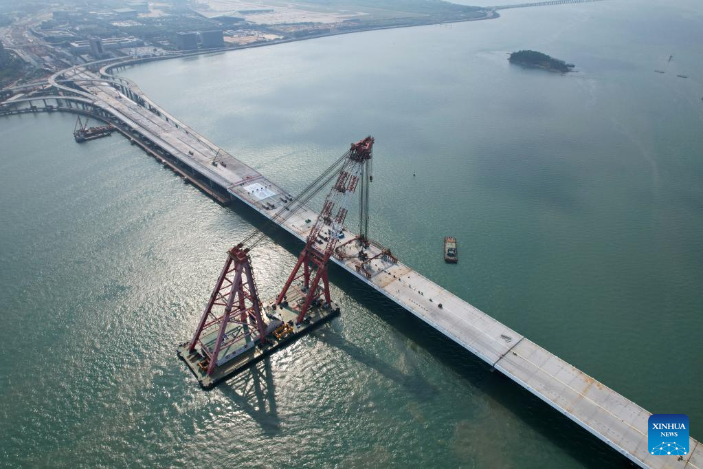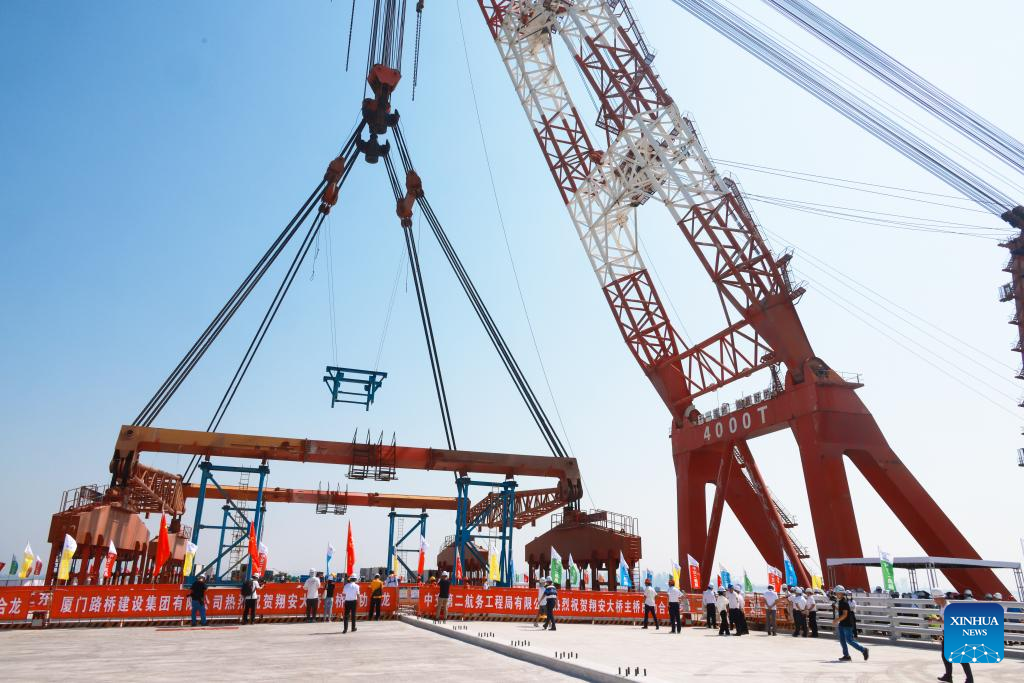 Photo taken on Sept. 12, 2022 shows the construction site of the Xiang'an Bridge during its closure in Xiamen, southeast China's Fujian Province. The bridge finished its final stage for closure on Monday. This 12-kilometer highway bridge, which consists of a 4.5-kilometer section across the sea, has a designed passing speed of 80 kilometers per hour upon completion. (Xinhua)