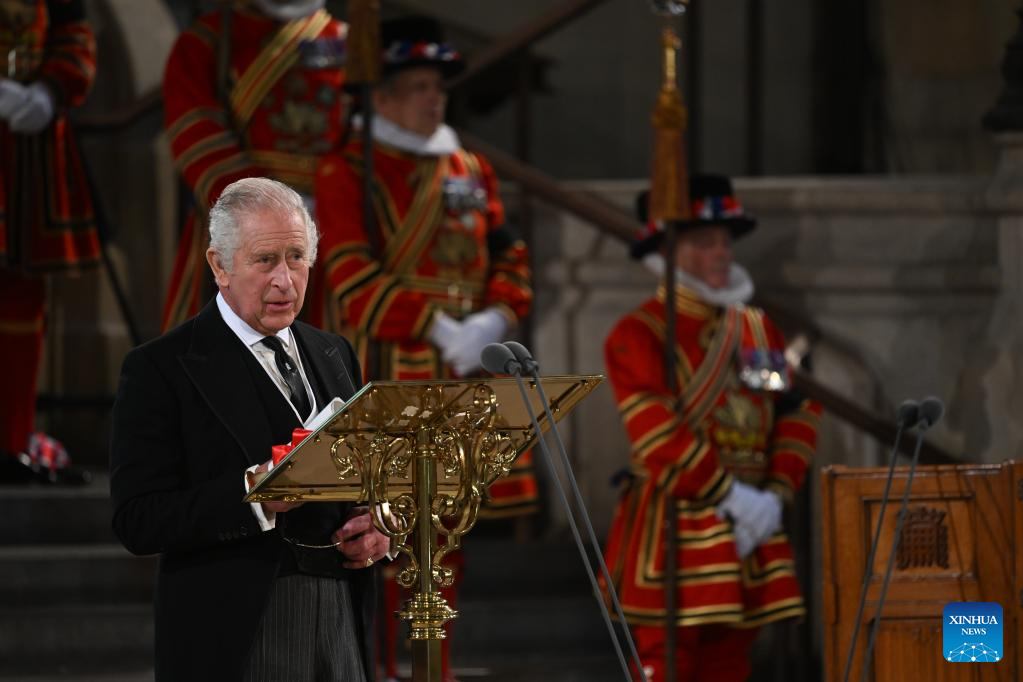 Britain's King Charles III delivers his first address to the parliament in Westminster Hall in London, Britain, Sept. 12, 2022. Britain's King Charles III said he felt "the weight of history" and vowed to follow the example set by his late mother, Queen Elizabeth II, in his first address to the parliament on Monday. (Jessica Taylor/UK Parliament/Handout via Xinhua)