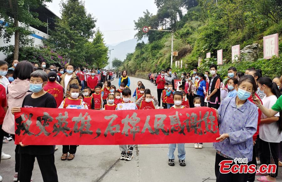 Local residents hold banners to bid farewell to rescue personnel in Shimian County of Ya'an City, southwest China's Sichuan Province, Sept. 13, 2022. (Photo provided to China News Service)