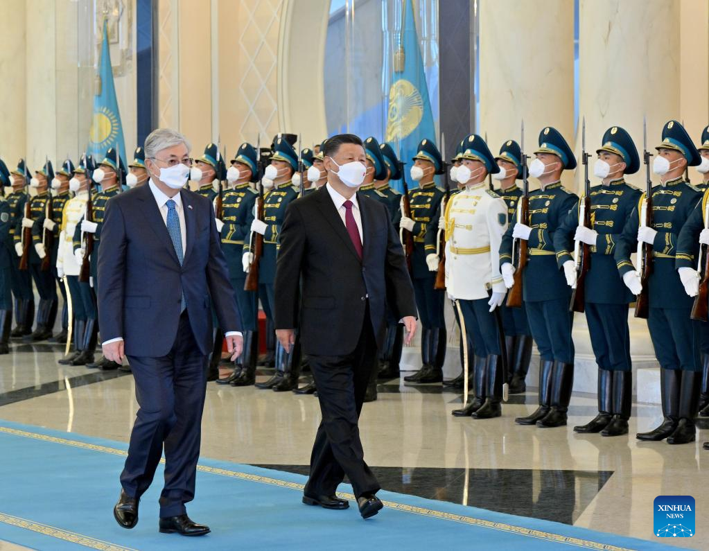 Tokayev held a grand welcome ceremony for Xi. The two heads of state jointly stood on the podium as the military band played the national anthems of China and Kazakhstan. Accompanied by Tokayev, Xi inspected the honor guard.
