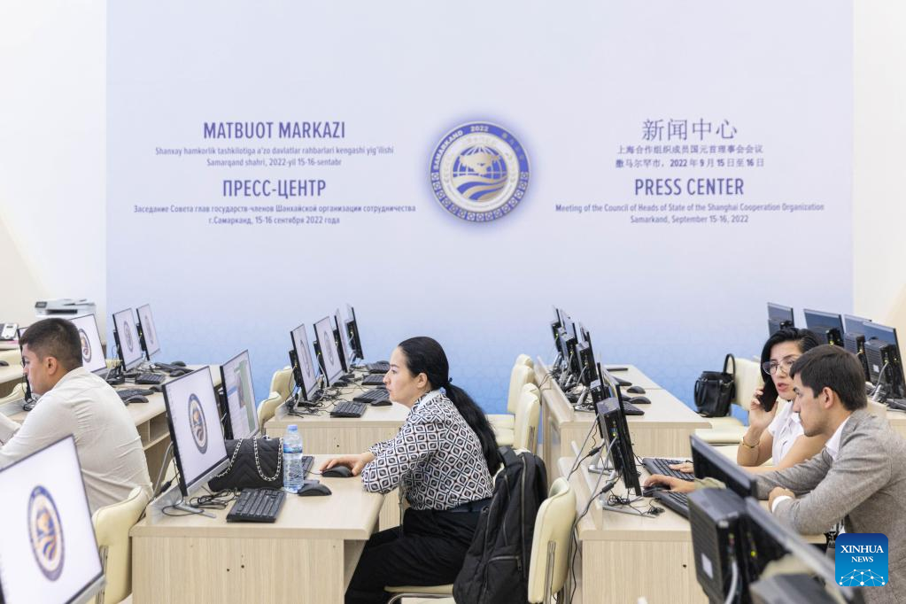 Media professionals work at the press center for the upcoming 22nd meeting of the Council of Heads of State of the Shanghai Cooperation Organization (SCO) in Samarkand, Uzbekistan, Sept. 14, 2022. (Xinhua/Bai Xueqi)