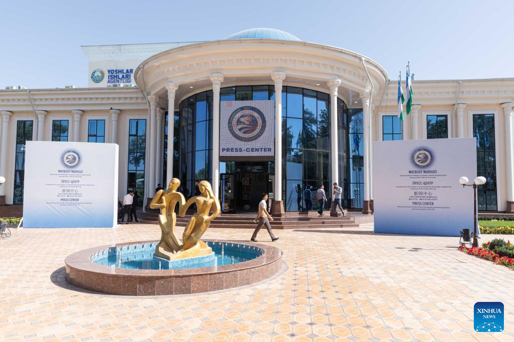 Photo taken on Sept. 14, 2022 shows an exterior view of the press center for the upcoming 22nd meeting of the Council of Heads of State of the Shanghai Cooperation Organization (SCO) in Samarkand, Uzbekistan. (Xinhua/Bai Xueqi)