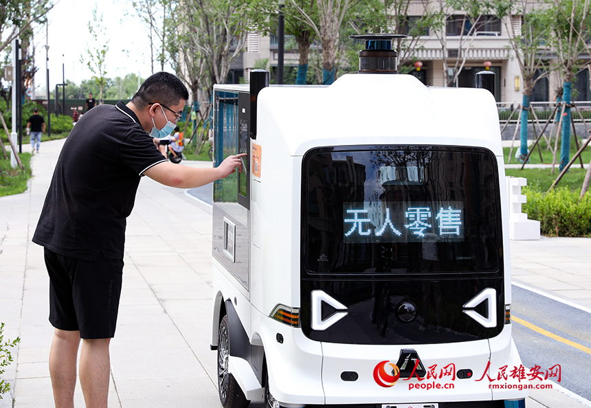 Photo shows a smart vending vehicle in the Rongdong district of Xiongan New Area, north China's Hebei Province. (People's Daily Online/Song Yewen)
