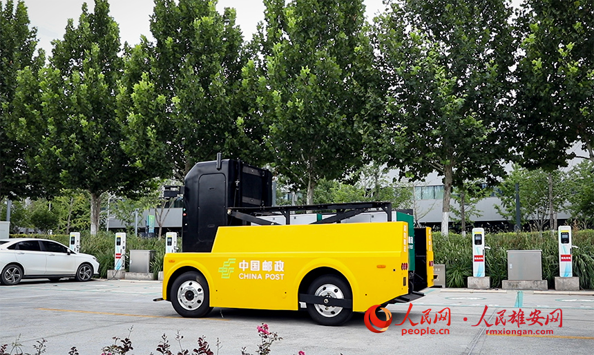 Photo shows a self-driving logistics vehicle running on a road in Xiongan New Area, north China's Hebei Province. (People's Daily Online/Song Yewen)