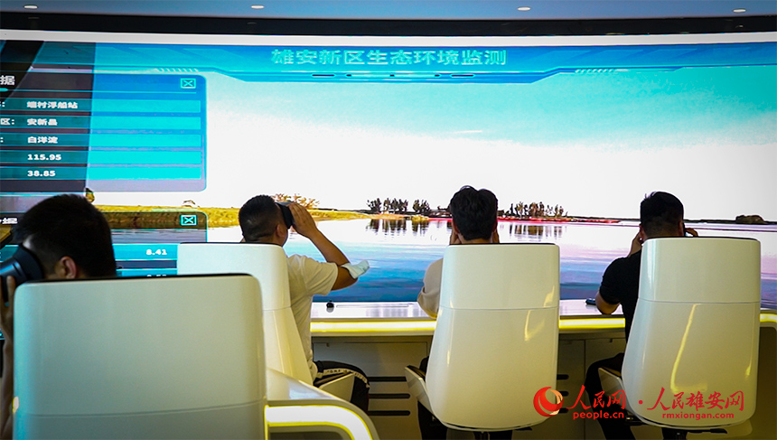 Researchers monitor a section of water through the use of 5G network technology and VR, at the Xiongan environmental monitoring center in Xiongan New Area, north China's Hebei Province. (People's Daily Online/Yang Hualong)