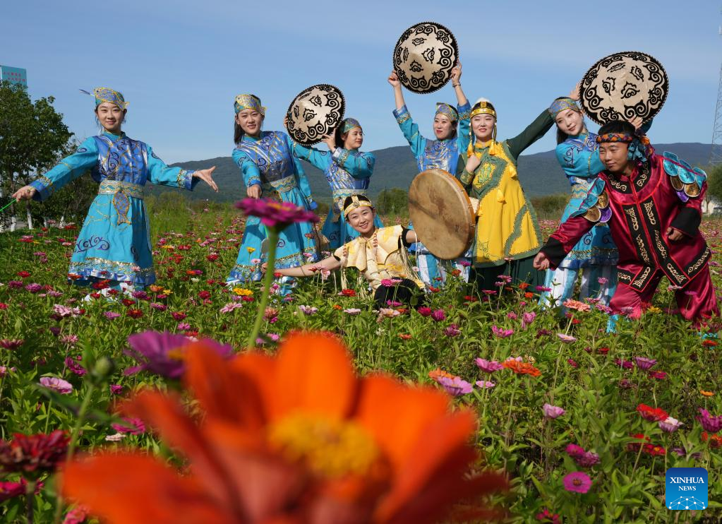 Shang Meihan spends time with local children at a flower field in the Hezhe ethnic village of Zhuaji in Wusu Town of Fuyuan City, northeast China's Heilongjiang Province, Sept. 4, 2022.