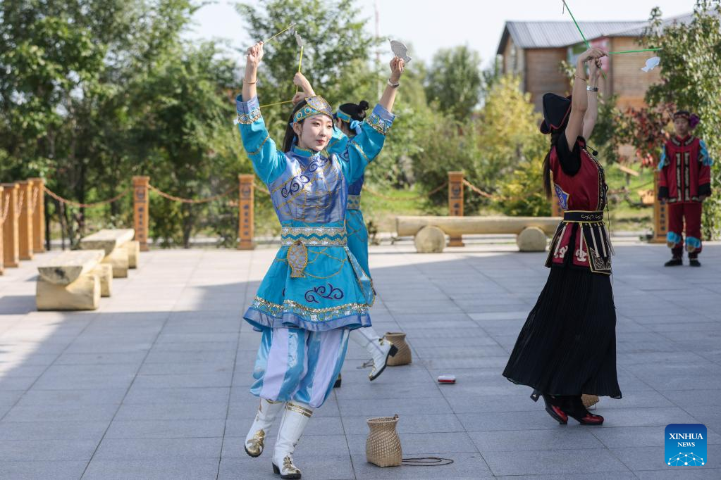 Shang Meihan (1st L) performs a Hezhe dance in the Hezhe ethnic village of Zhuaji in Wusu Town of Fuyuan City, northeast China's Heilongjiang Province, Sept. 4, 2022.