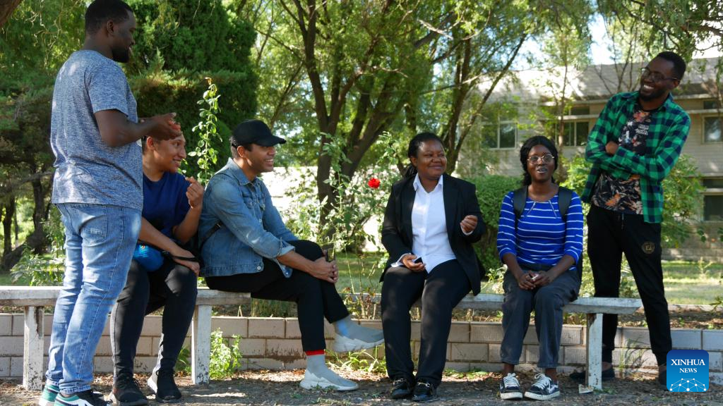 Zhang Ning (3rd R) chats with international students at Jinzhou Medical University in Jinzhou, northeast China's Liaoning Province, Sept. 5, 2022. Donkor Adwoa Jennifer, also known by her Chinese name as Zhang Ning, comes from Ghana and has lived in China for 13 years. While in China, Zhang gained her bachelor's and post-graduate degrees in clinical medicine. Now she has become a teacher at Jinzhou Medical University in Jinzhou. In the future, Zhang Ning plans to pursue her doctoral degree and then return to Ghana to pay back to her country with the medical knowledge she has learned. (Xinhua/Yang Qing)