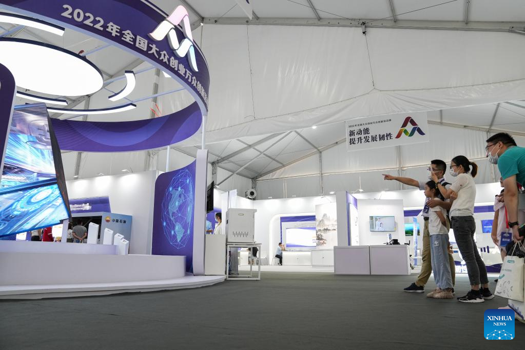 People visit the main venue of 2022 national mass entrepreneurship and innovation week in Hefei, capital of east China's Anhui Province, Sept. 17, 2022. China holds a national mass entrepreneurship and innovation week from Sept. 15 to 21. Themed "Innovation drives vitality, entrepreneurship creates employment," the annual event, whose main venue is set in Hefei this year, is expected to see the launch of nearly 1,000 activities across the country, both online and offline. (Xinhua/Du Yu)