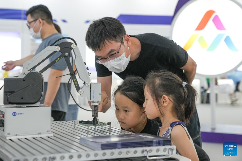 Children look at an intelligent mechanical arm at the main venue of 2022 national mass entrepreneurship and innovation week in Hefei, capital of east China's Anhui Province, Sept. 17, 2022. China holds a national mass entrepreneurship and innovation week from Sept. 15 to 21. Themed "Innovation drives vitality, entrepreneurship creates employment," the annual event, whose main venue is set in Hefei this year, is expected to see the launch of nearly 1,000 activities across the country, both online and offline. (Xinhua/Du Yu)