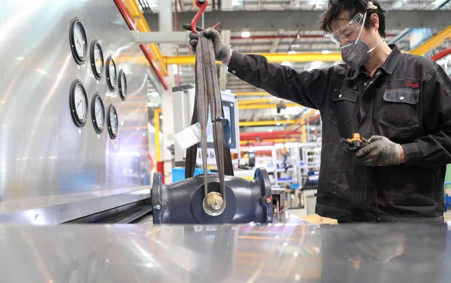 An employee works at the workshop of Danfoss (Anshan) Co., Ltd. in Anshan, northeast China's Liaoning Province, April 23, 2020. (Xinhua/Yao Jianfeng)