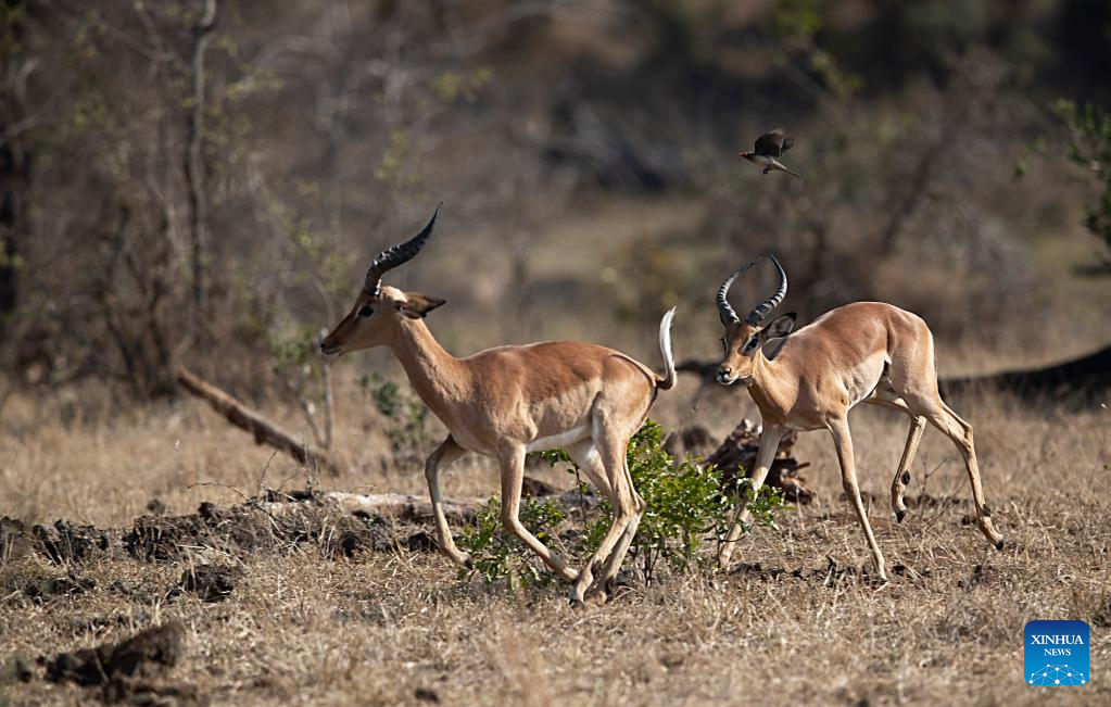 Photo taken on Sept. 17, 2022 shows impalas at the Kruger National Park, Mpumalanga, South Africa. Kruger National Park is one of the largest game reserves in Africa. Covering an area of 19,485 square kilometers in northeastern South Africa, the park is a home to an impressive number of species. (Xinhua/Zhang Yudong)