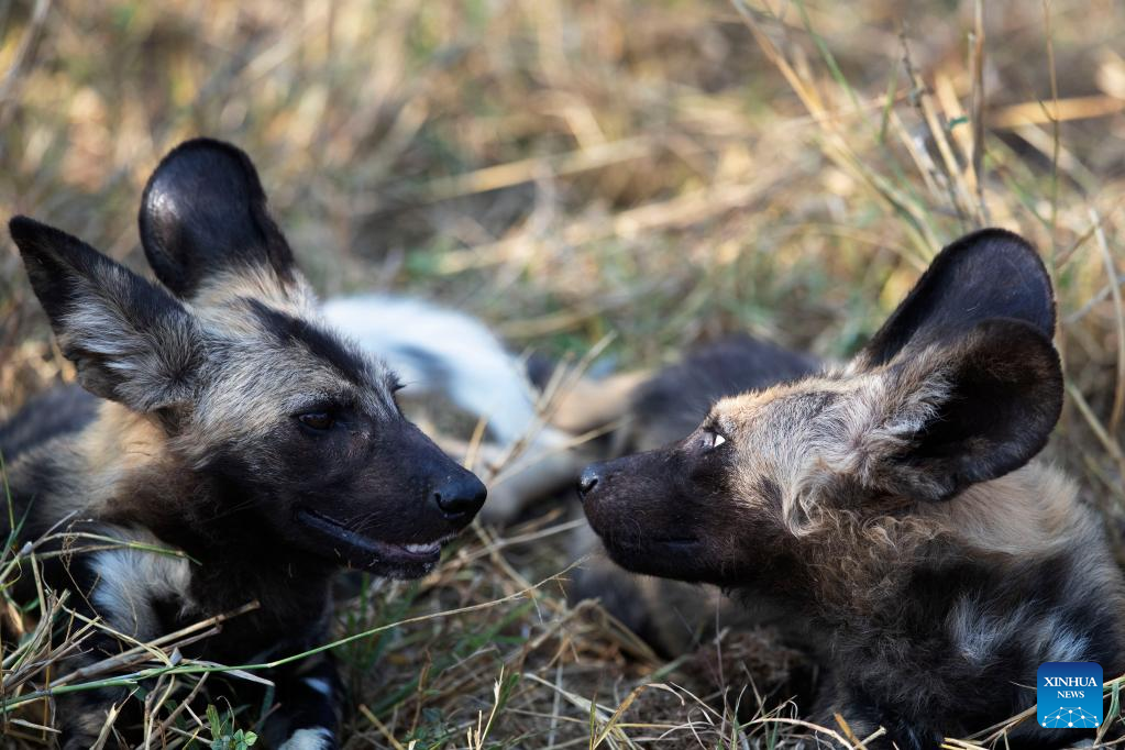 Photo taken on Sept. 17, 2022 shows African wild dogs at the Kruger National Park, Mpumalanga, South Africa. Kruger National Park is one of the largest game reserves in Africa. Covering an area of 19,485 square kilometers in northeastern South Africa, the park is a home to an impressive number of species. (Xinhua/Zhang Yudong)