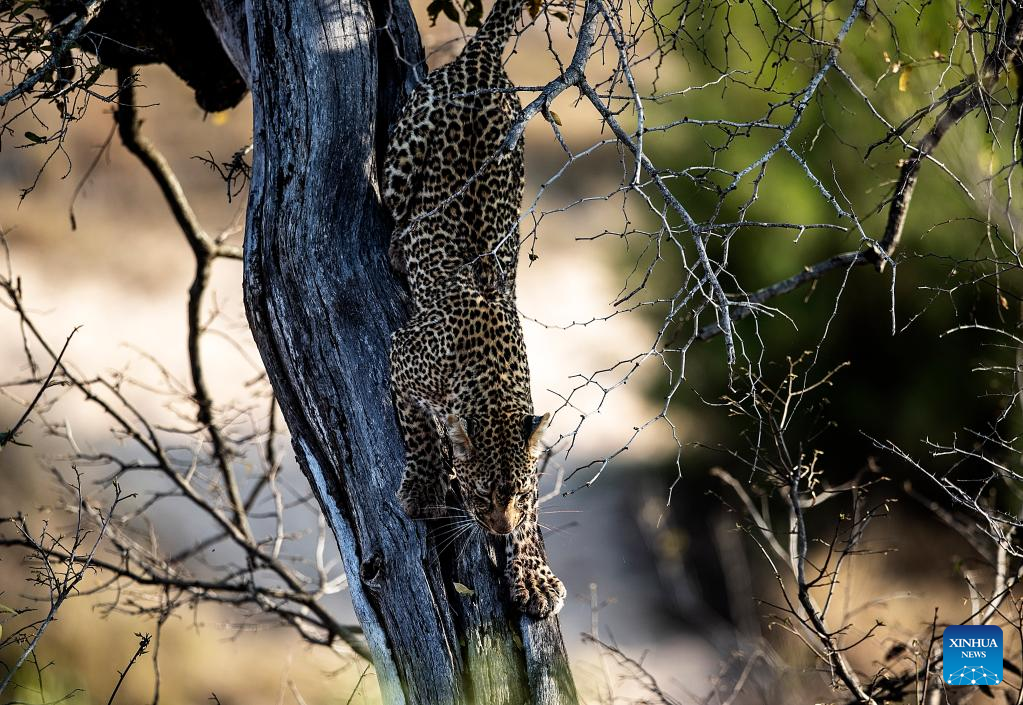 Photo taken on Sept. 17, 2022 shows an African leopard at the Kruger National Park, Mpumalanga, South Africa. Kruger National Park is one of the largest game reserves in Africa. Covering an area of 19,485 square kilometers in northeastern South Africa, the park is a home to an impressive number of species. (Xinhua/Zhang Yudong)