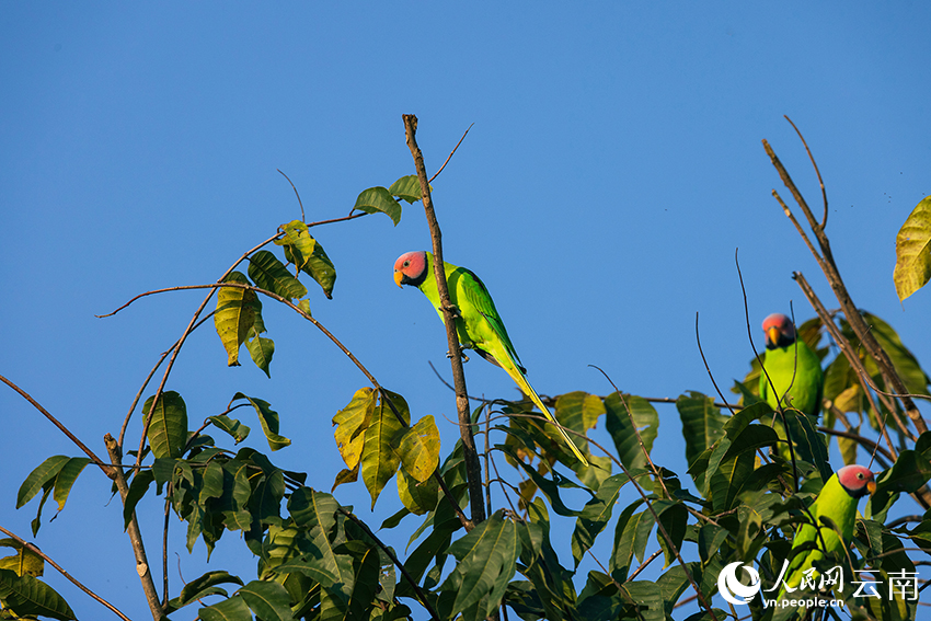 Three male blossom-headed parakeets perch on tree branches. (Photo/Jia Lei)