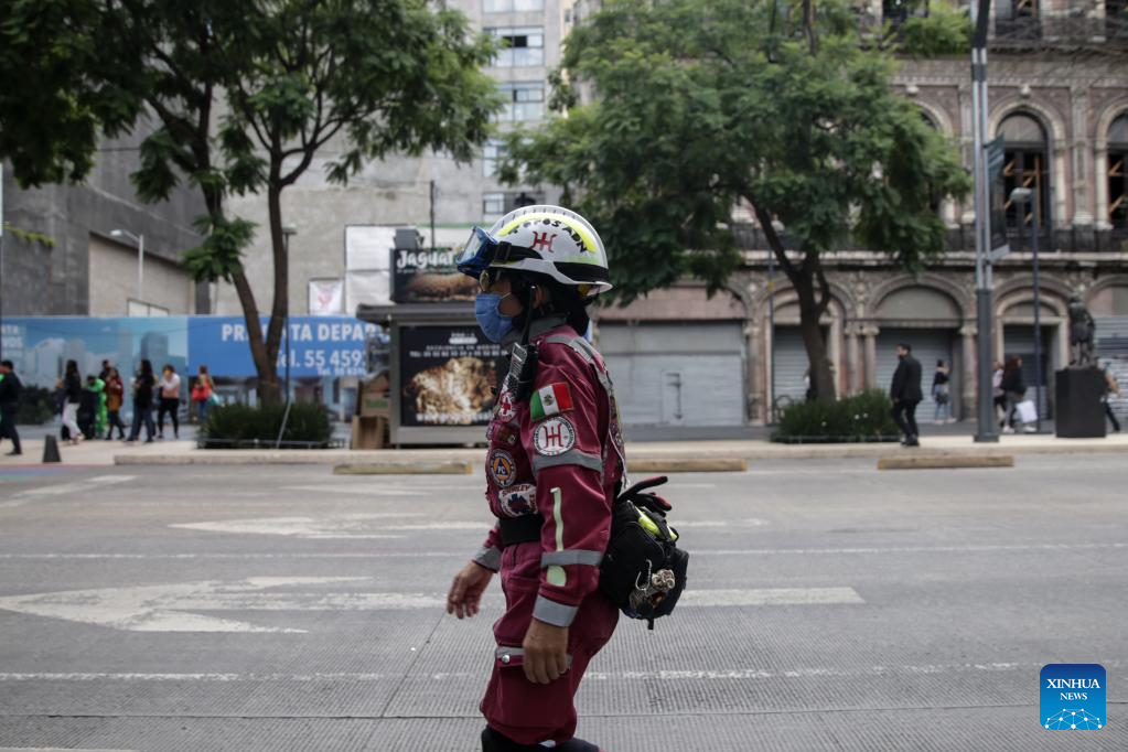 A member of the Mexican National Civil Protection works after an earthquake in Mexico City, Mexico, on Sept. 19, 2022. (Xinhua/Francisco Canedo)