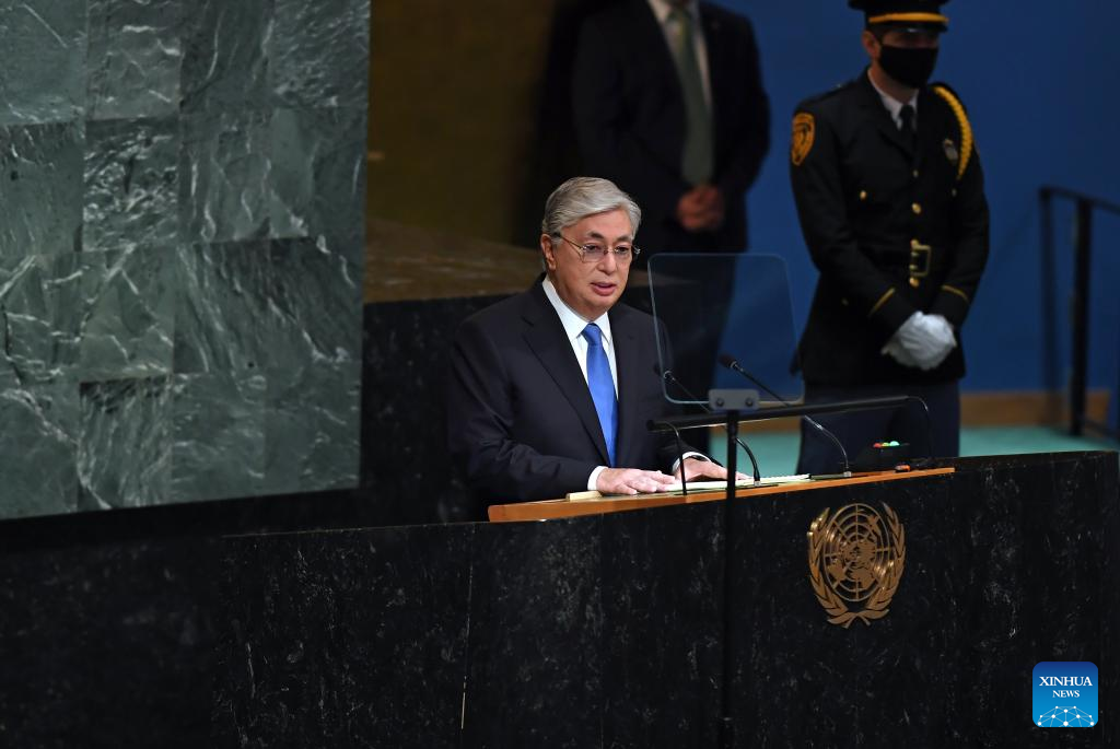 Kazakh President Kassym-Jomart Tokayev speaks during the General Debate of the 77th session of the UN General Assembly at the UN headquarters in New York, on Sept. 20, 2022. The General Debate of the 77th session of the UN General Assembly opened on Tuesday with the theme of "A watershed moment: transformative solutions to interlocking challenges." (Xinhua/Li Rui)