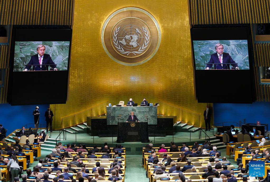 UN Secretary-General Antonio Guterres (at the podium and on the screens) speaks during the opening of the General Debate of the 77th session of the UN General Assembly at the UN headquarters in New York, Sept. 20, 2022. The General Debate of the 77th session of the UN General Assembly opened on Tuesday with the theme of "A watershed moment: transformative solutions to interlocking challenges." (Xinhua/Wang Ying)