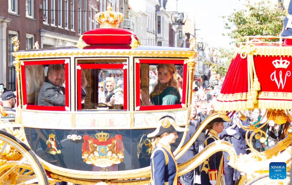 Dutch King Willem-Alexander and Princess Amalia wave to people in the Glass Coach in the Hague, the Netherlands, on the Prince's Day, Sept. 20, 2022. The third Tuesday in September is Prince's Day in the Netherlands. It marks the opening of the Dutch parliamentary season, and on this day the reigning monarch outlines the government's plans for the year ahead. (Photo by Sylvia Lederer/Xinhua)