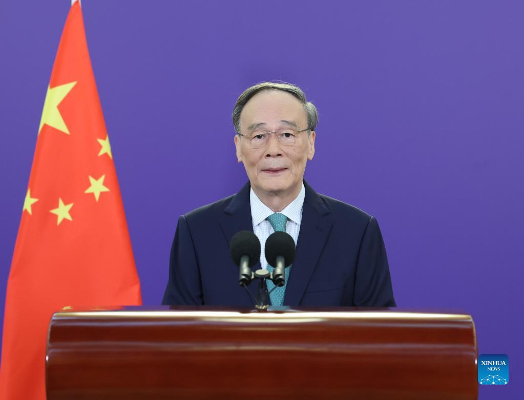 Chinese Vice President Wang Qishan makes a keynote speech while attending the commemorative event for the International Day of Peace 2022 via video link on Sept. 21, 2022. (Xinhua/Wang Ye)