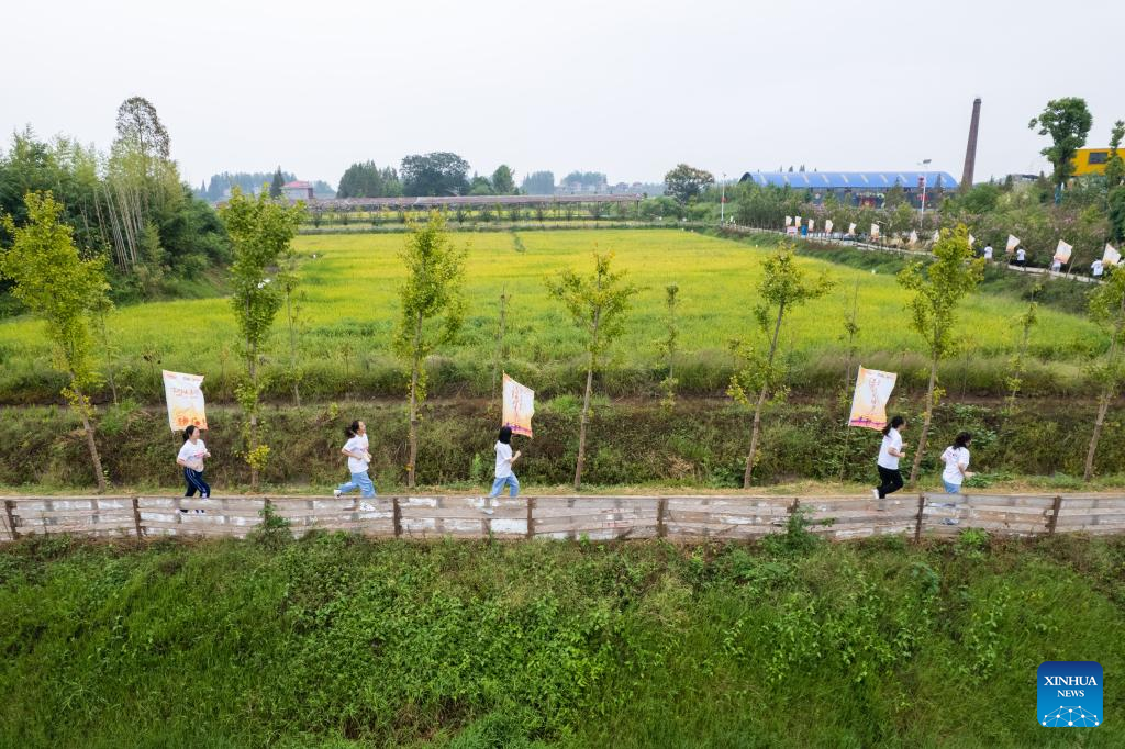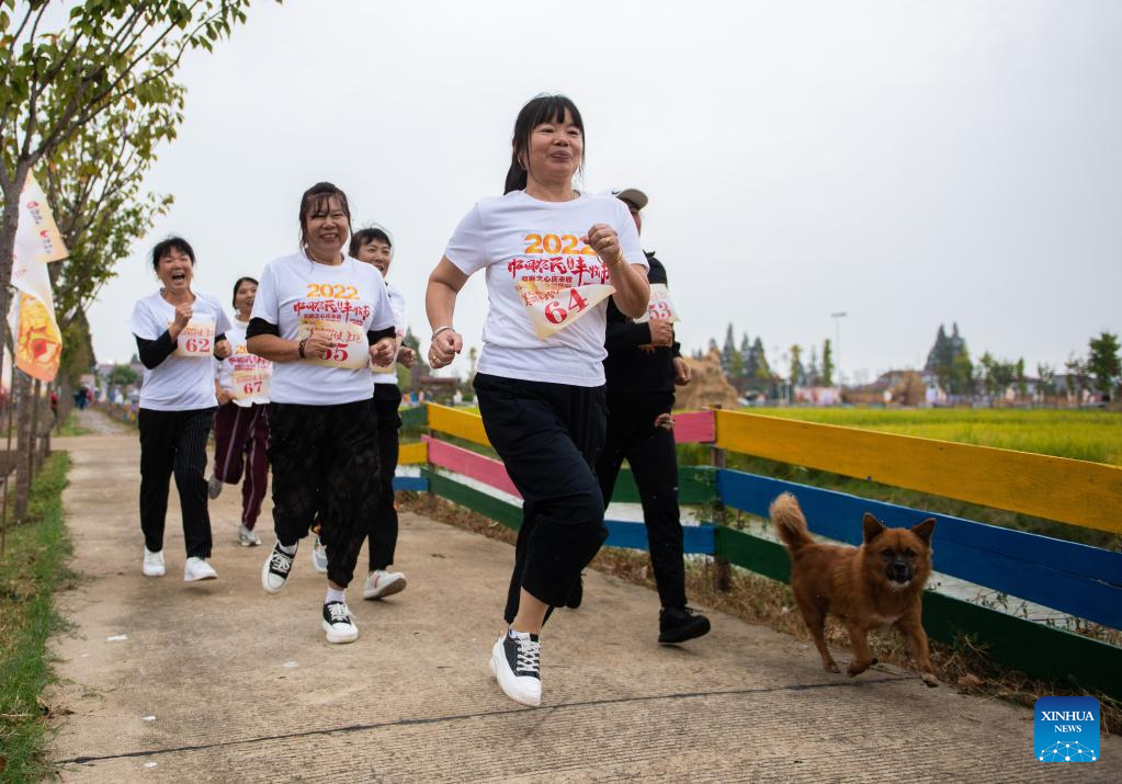 People participate in a running activity in Dongsheng Village of Mahekou Township in Nanxian County, central China's Hunan Province, Sept. 21, 2022. A paddy fun game was organized here on Wednesday for locals and tourists to welcome the upcoming Chinese farmers' harvest festival. (Xinhua/Chen Sihan)