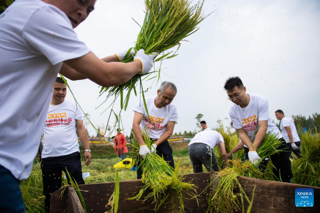 People participate in a rice harvesting game in Dongsheng Village of Mahekou Township in Nanxian County, central China's Hunan Province, Sept. 21, 2022. A paddy fun game was organized here on Wednesday for locals and tourists to welcome the upcoming Chinese farmers' harvest festival. (Xinhua/Chen Sihan)