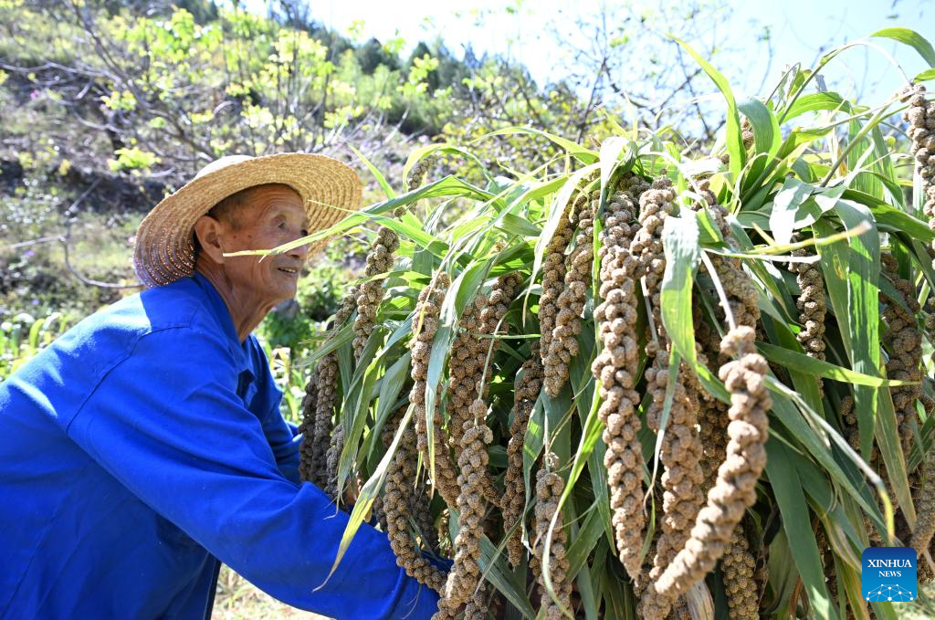 A villager works in a millet field in Nihe Village of Luozhuangzi Township, Jizhou District, north China's Tianjin, Sept. 21, 2022. Nihe Village has increased residents' incomes by promoting ecological organic millet planting in recent years. Cooperatives are set up to take charge of planting, procurement, packaging and sales of millets. (Xinhua/Zhao Zishuo)