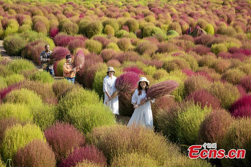 Farmers are busy harvesting the Kochia scoparia, or red broom grass, in Caojiagou village of Liulin county, north China's Shanxi Province. The broom grass turns to bright red color in autumn and can be used to make brooms after it is dried. (Photo: China News Service/Wang Fengyun)
