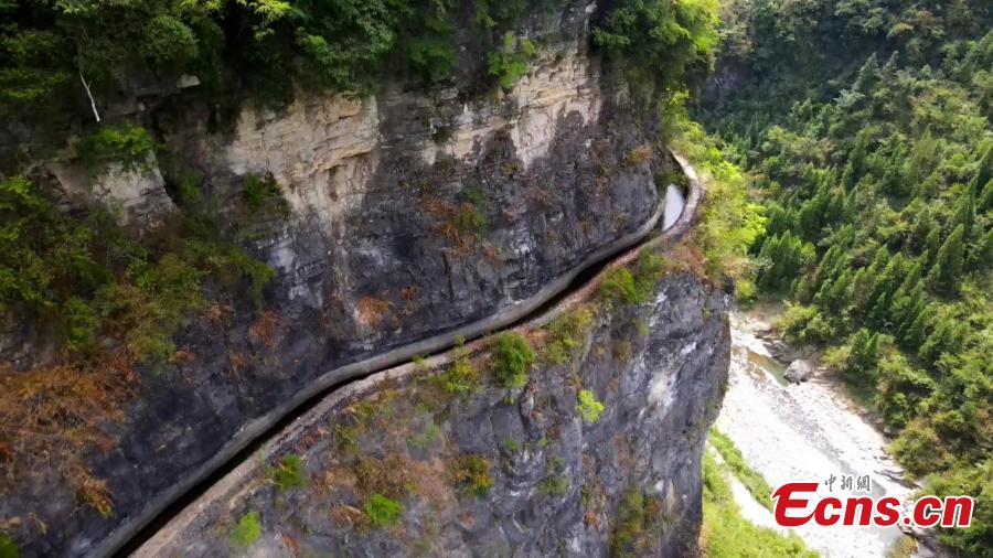 Photo shows an artificial canal built along a cliff in Huanghe town in Chongqing, Sept. 20, 2022. The 15-kilometer-long canal was constructed at an elevation of about 1,000 meters along the cliff in the 1970s. (Photo: China News Service/Li Xiaohua)