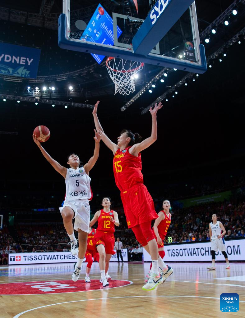 Han Xu (R, front) of China blocks Park Jihyun of South Korea during a Group A match between China and South Korea at the Women's Basketball World Cup 2022 in Sydney, Australia, Sept. 22, 2022. (Photo by Hu Jingchen/Xinhua)
