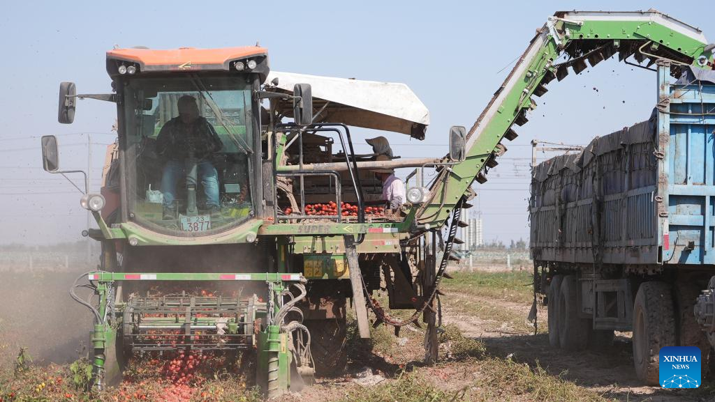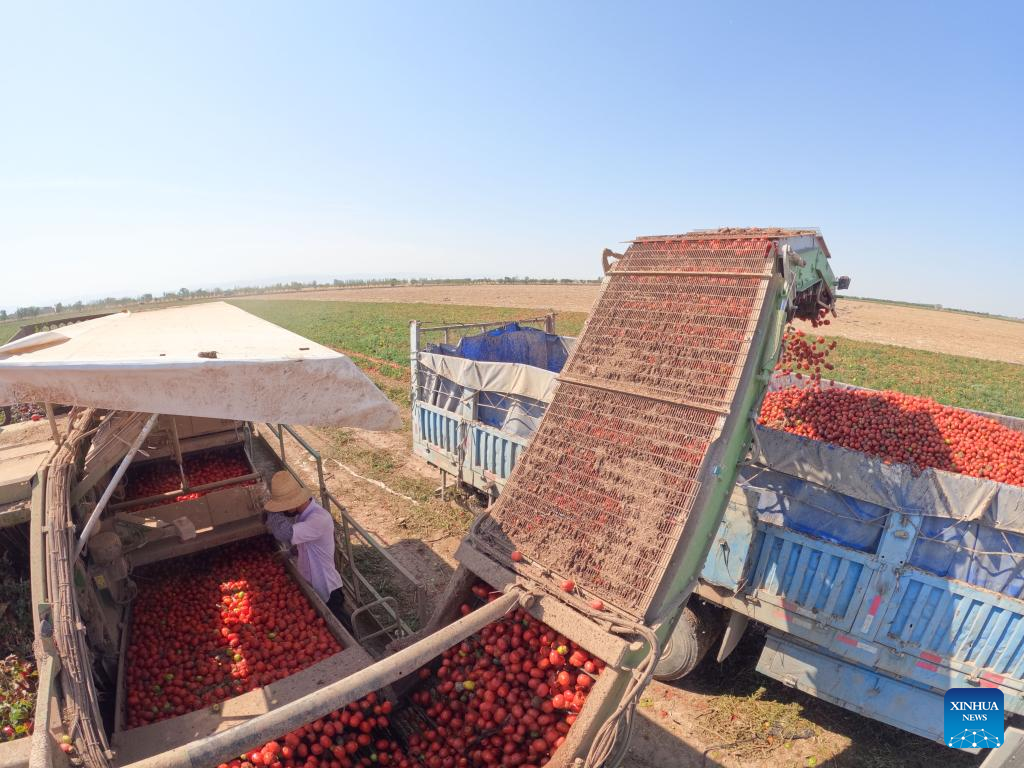 Villagers havest tomatoes in Xingfu Village of Changji, northwest China's Xinjiang Uygur Autonomous Region, Sept. 19, 2022. (Photo by Feng Guofeng/Xinhua)