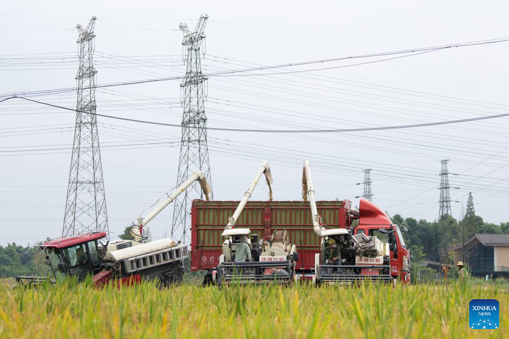 A villager harvests paddy rice in Xinhua Village of Chongzhou, southwest China's Sichuan Province, Sept. 21, 2022. (Xinhua/Xu Bingjie)