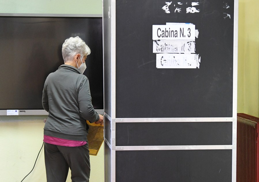 A citizen prepares to cast the ballot at a polling station in Rome, Italy, Sept. 25, 2022. (Xinhua/Jin Mamengni)