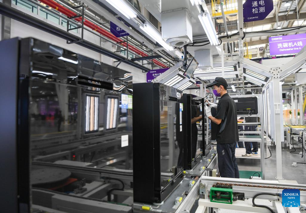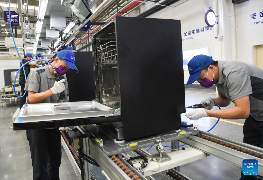 Workers are seen at the production line of a dishwasher interconnected factory of Chongqing Haier Washing Electric Appliances Co.LTD in southwest China's Chongqing, Sept. 25, 2022. A dishwasher interconnected factory of Chongqing Haier Washing Electric Appliances Co.LTD was officially put into production here at Gangcheng Industry Park in Jiangbei District of Chongqing on Sunday. This 42,000-square-meter factory, with a designed annual output of one million dishwashers, will utilize advanced technologies like 5G and Industrial Internet towards the digitization and intelligentization of dishwasher production. (Xinhua/Wang Quanchao)