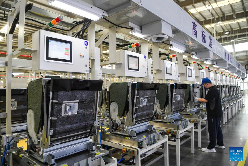 Photo taken on Sept. 25, 2022 shows the production line of a dishwasher interconnected factory of Chongqing Haier Washing Electric Appliances Co.LTD in southwest China's Chongqing. A dishwasher interconnected factory of Chongqing Haier Washing Electric Appliances Co.LTD was officially put into production here at Gangcheng Industry Park in Jiangbei District of Chongqing on Sunday. This 42,000-square-meter factory, with a designed annual output of one million dishwashers, will utilize advanced technologies like 5G and Industrial Internet towards the digitization and intelligentization of dishwasher production. (Xinhua/Wang Quanchao)