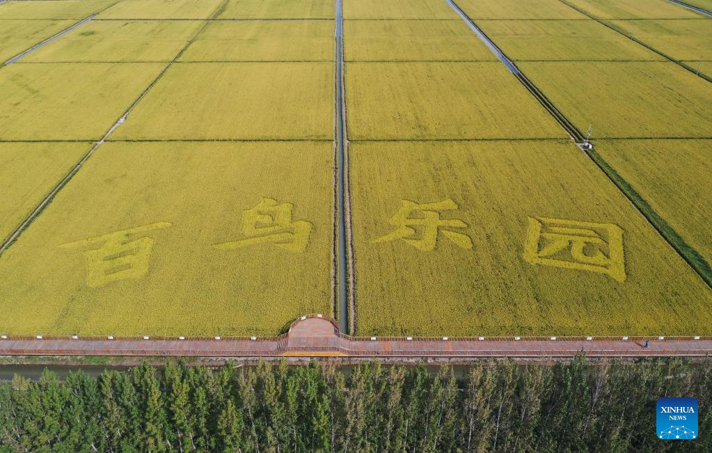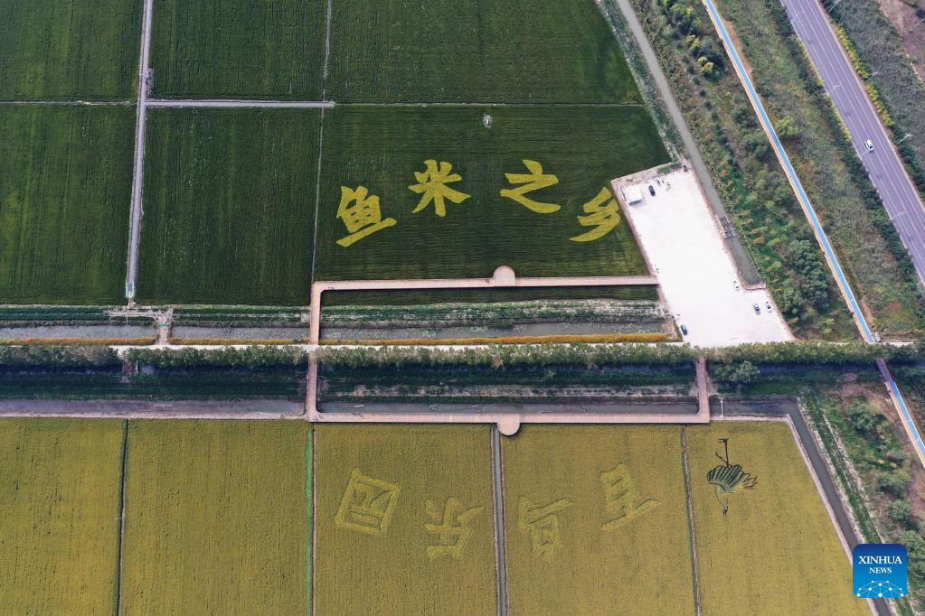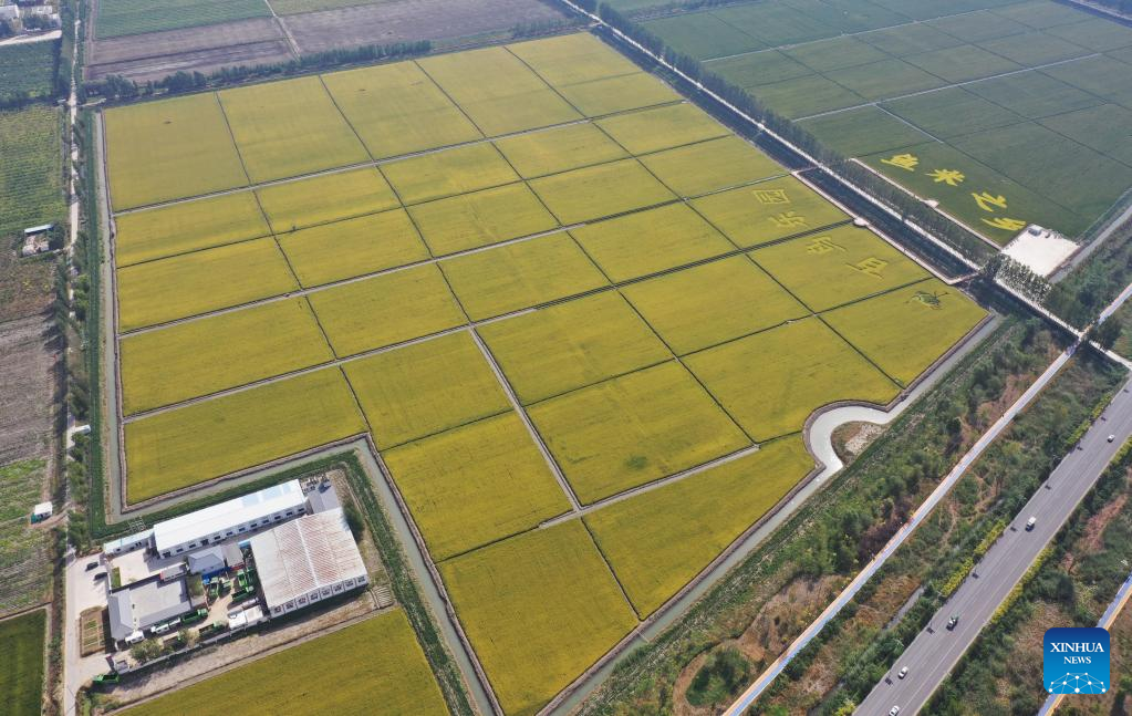 Aerial photo taken on Sept. 24, 2022 shows paddy fields at a rice planting demonstration zone in Dawang Town of Anxin County of Xiong'an New Area, north China's Hebei Province. Anxin County of Xiong'an New Area has a long history of rice cultivation. Located near Baiyangdian Lake, the largest wetland ecosystem in northern China, Anxin County has exceptional irrigation advantage in rice planting. In recent years, Anxin County has adopted rice-fish and rice-crab co-culture modes to build a modern eco-agriculture demonstration zone. (Xinhua/Zhu Xudong)