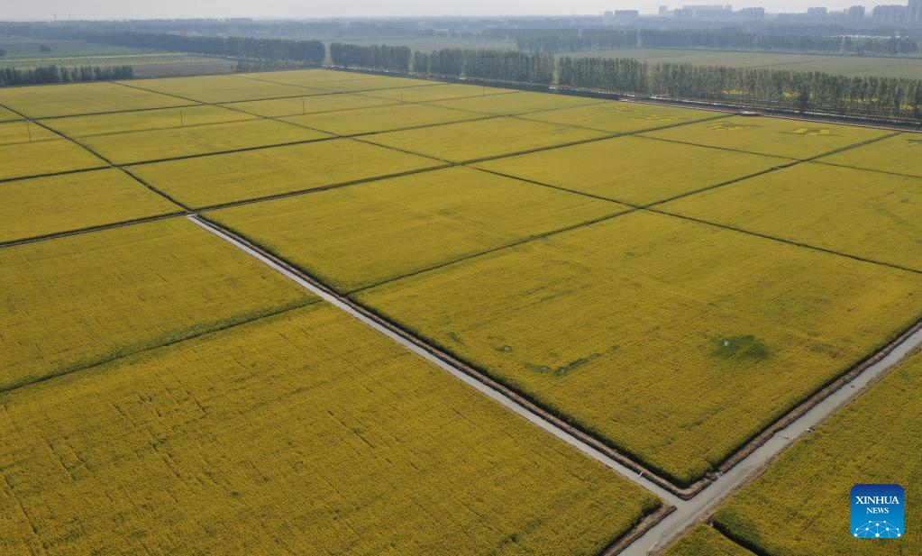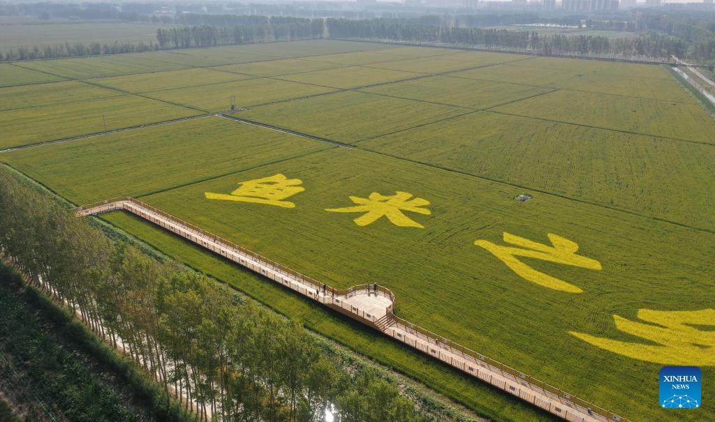 Aerial photo taken on Sept. 24, 2022 shows paddy fields at a rice planting demonstration zone in Dawang Town of Anxin County of Xiong'an New Area, north China's Hebei Province. Anxin County of Xiong'an New Area has a long history of rice cultivation. Located near Baiyangdian Lake, the largest wetland ecosystem in northern China, Anxin County has exceptional irrigation advantage in rice planting. In recent years, Anxin County has adopted rice-fish and rice-crab co-culture modes to build a modern eco-agriculture demonstration zone. (Xinhua/Yang Shiyao)