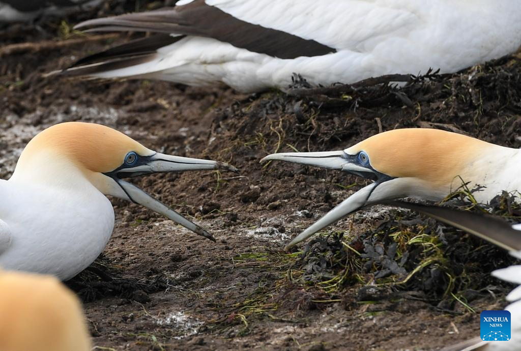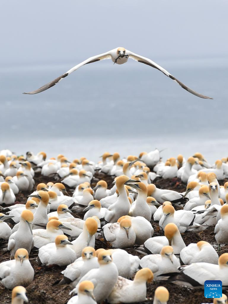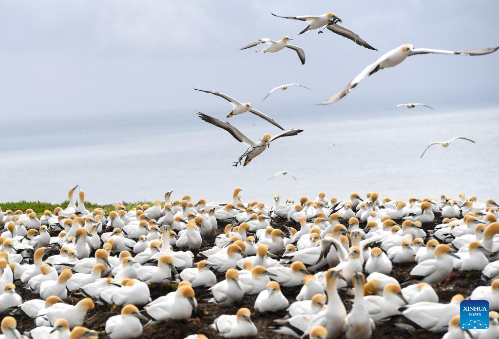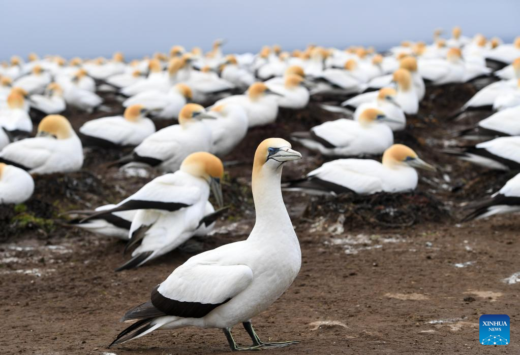Photo taken on Sept. 25, 2022 shows gannets at Cape Kidnappers, New Zealand. The four gannet colonies at Cape Kidnappers located on the east coast of the north island of New Zealand are the largest mainland gannet colony in New Zealand, with an estimated 20,000 gannets living here. Adult gannets arrive at Cape Kidnappers around July every year to begin courtship and nest building. (Xinhua/Guo Lei)