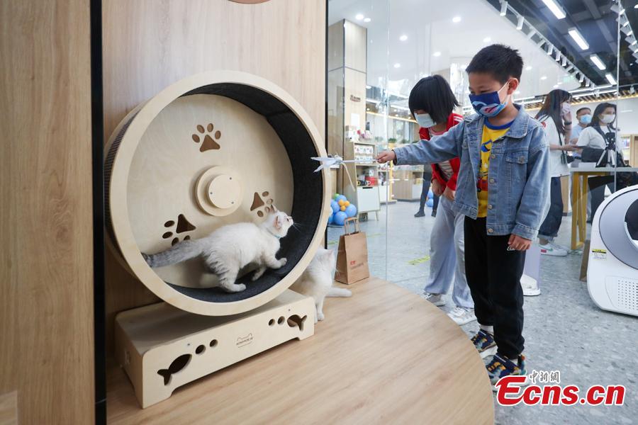 Children plays with a cat in a pet-themed Xinhua Bookstore in Beijing on Sept. 25, 2022. Xinhua Bookstore unveiled its first pet-themed bookstore in Beijing on Sunday. (Photo: China News Service/Jia Tianyong)
