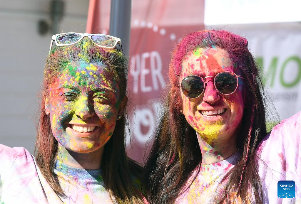 A girl is sprayed with colored powder at the "Color Sky 5K" running festival in Ankara, Trkiye, on Sept. 25, 2022. (Photo by Mustafa Kaya/Xinhua)