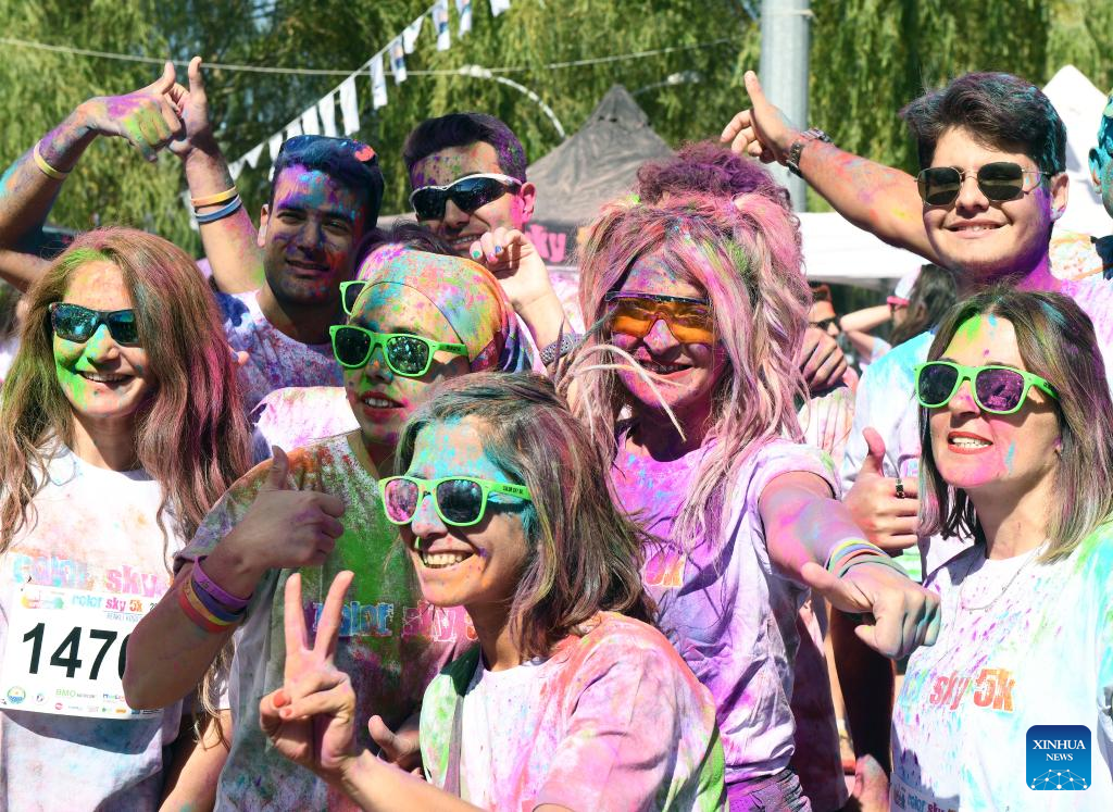 Runners pose for photos at the "Color Sky 5K" running festival in Ankara, Trkiye, on Sept. 25, 2022. (Photo by Mustafa Kaya/Xinhua)