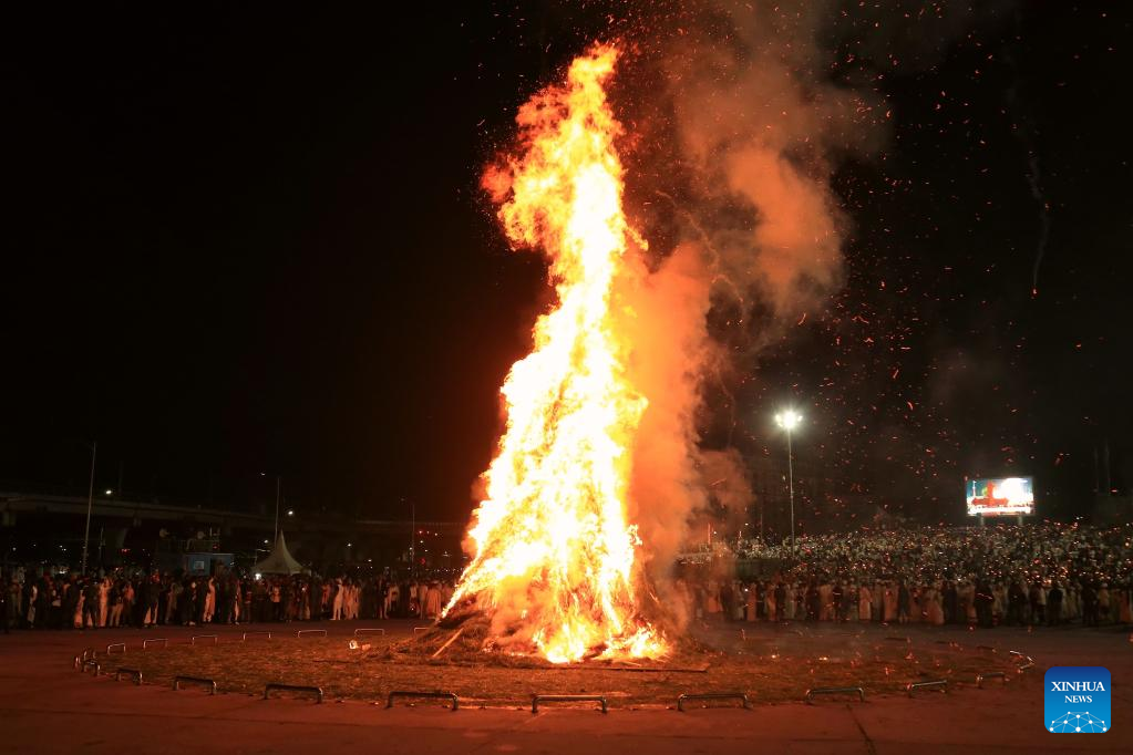 People build a large bonfire in celebration of the Meskel festival in Addis Ababa, capital of Ethiopia, on Sept. 26, 2022. Ethiopian Orthodox Christians on Monday marked the Meskel festival, a religious festival celebrated among Orthodox Christians to mark the finding of the True Cross. (Str/Xinhua)